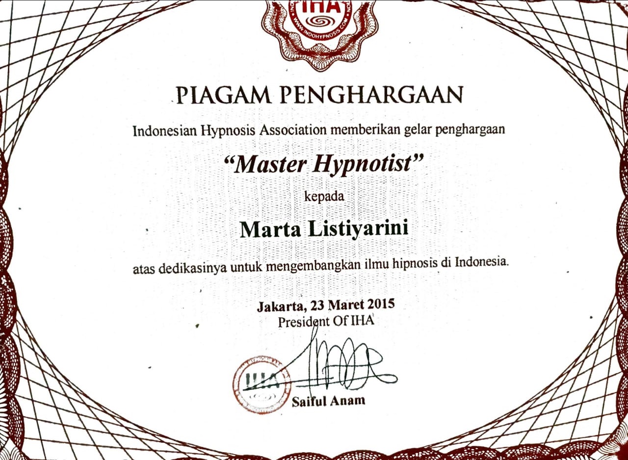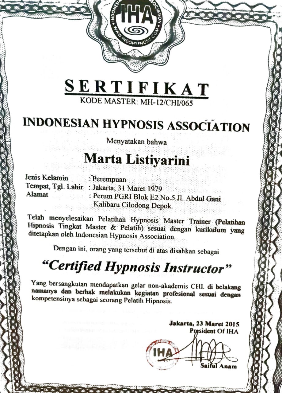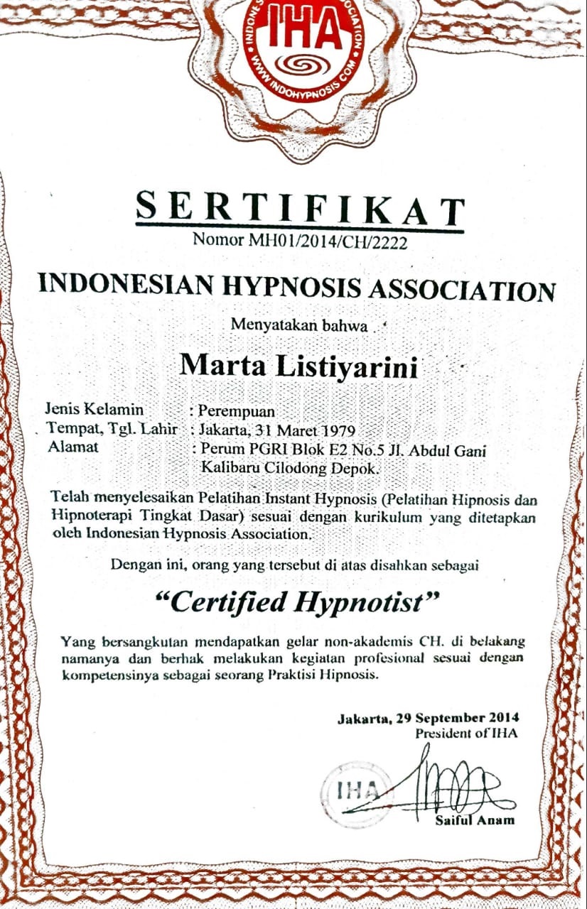 Saya lahir di Jakarta pada tanggal 31 Maret 1979. Saya tinggal di depok Jawa barat. Sebelum menjadi hipnoterapis, saya adalah karyawati dan ibu rumah tangga. Perkenalan saya dengan hipnosis sekitar 8 tahun yang lalu.ketika saya mengalami kecelakaan ketika mengendarai mobil. Saya mengalami trauma tidak mau menyetir mobil lagi. Lalu keluarga saya membawa saya ke klinik hipnoterapis untuk di terapi. Hanya dalam satu kali terapi trauma saya hilang dan saya berani menyetir mobil lagi. Setelah saya merasakan manfaat dari hipnosis, kemudian saya belajar hipnosis dan NLP secara formal dengan trainer-trainer yang sudah senior seperti Anam Wijaya Dutha,Asep Haerul Gani ( Psikolog ), R.H Wiwoho, dan saya belajar quantum healing dengan Ifan Winarno. Banyak metode terapi yang saya gunakan seperti hipnosis, NLP ( Neuro Linguistic Program ), EFT ( Emotional Freedom technique ), Ericksonian Hypnoterapi,Forgiveness terapy, Egostate dan Introject terapy, Jessica terapy, Metaphisical Hypnosis, clean language and brief terapy dan quantum healing. Alhamdulillah saya sudah memiliki klinik sendiri dan sudah banyak orang yang merasakan manfaat dari terapi dari saya. Dengan biaya yang cukup terjangkau anda bisa mendapatkan layanan terapi profesional.