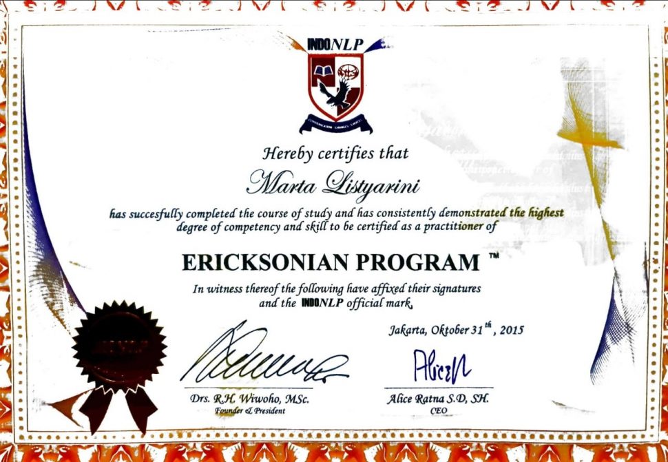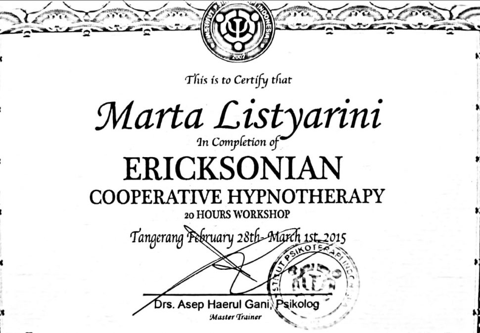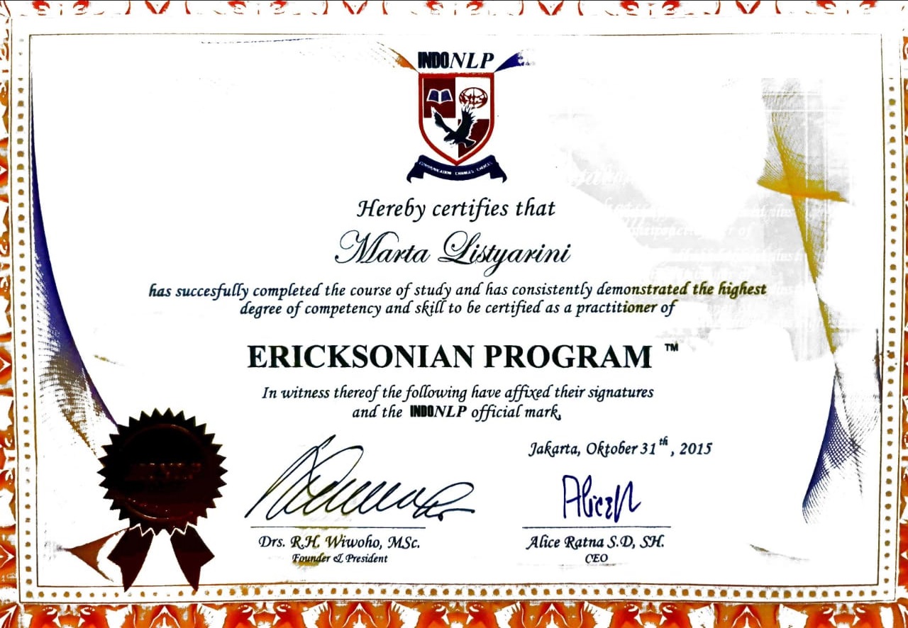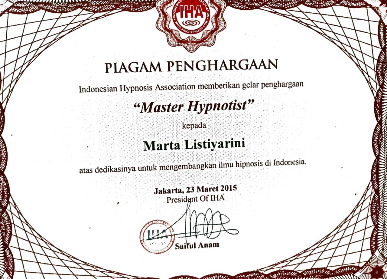 Saya lahir di Jakarta pada tanggal 31 Maret 1979. Saya tinggal di depok Jawa barat. Sebelum menjadi hipnoterapis, saya adalah karyawati dan ibu rumah tangga. Perkenalan saya dengan hipnosis sekitar 8 tahun yang lalu.ketika saya mengalami kecelakaan ketika mengendarai mobil. Saya mengalami trauma tidak mau menyetir mobil lagi. Lalu keluarga saya membawa saya ke klinik hipnoterapis untuk di terapi. Hanya dalam satu kali terapi trauma saya hilang dan saya berani menyetir mobil lagi. Setelah saya merasakan manfaat dari hipnosis, kemudian saya belajar hipnosis dan NLP secara formal dengan trainer-trainer yang sudah senior seperti Anam Wijaya Dutha,Asep Haerul Gani ( Psikolog ), R.H Wiwoho, dan saya belajar quantum healing dengan Ifan Winarno. Banyak metode terapi yang saya gunakan seperti hipnosis, NLP ( Neuro Linguistic Program ), EFT ( Emotional Freedom technique ), Ericksonian Hypnoterapi,Forgiveness terapy, Egostate dan Introject terapy, Jessica terapy, Metaphisical Hypnosis, clean language and brief terapy dan quantum healing. Alhamdulillah saya sudah memiliki klinik sendiri dan sudah banyak orang yang merasakan manfaat dari terapi dari saya. Dengan biaya yang cukup terjangkau anda bisa mendapatkan layanan terapi profesional.